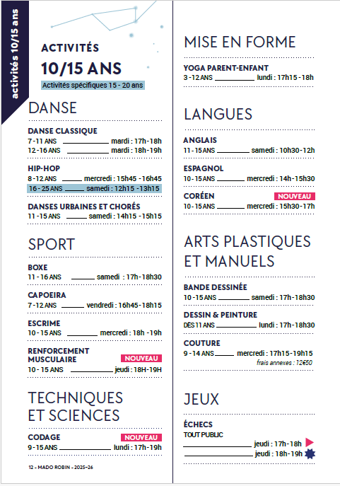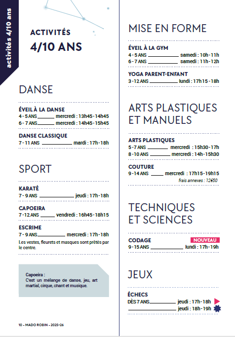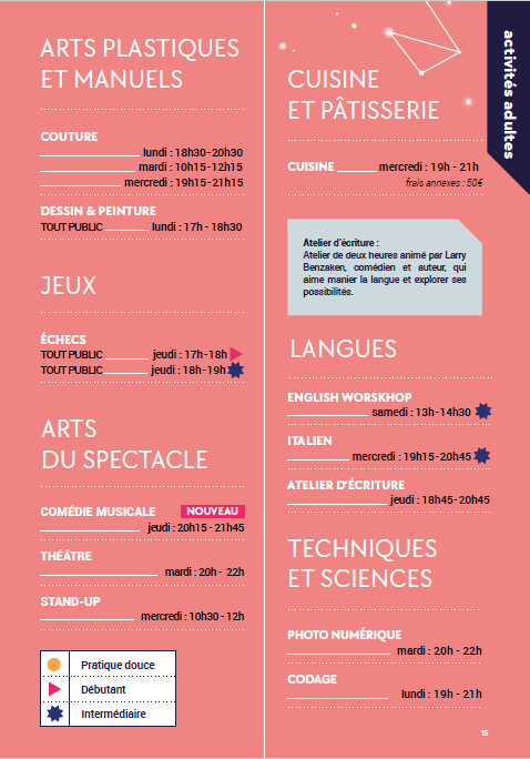 Découvrez une programmation d’activités riches et variées où chacun peut y trouver un espace pour s’exprimer, apprendre et se réaliser.